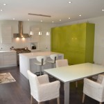 - Granite with green apple finish cabinetry.